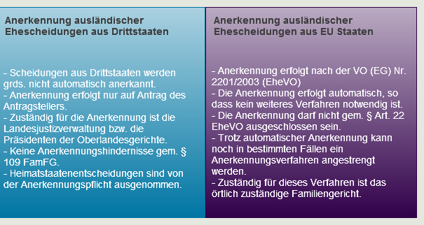 With regard to the recognition of foreign divorces in Germany, a fundamental distinction must be made between the recognition of divorces from EU member states and the recognition of divorces from states not covered by Regulation (EC) No. 2201/2003 (hereinafter referred to as third countries).