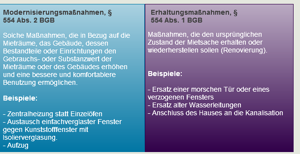 § Section 554 (2), (3) BGB concerns measures to improve the rented property. According to the judicial definition, modernisation measures are all structural changes to the rented property that increase the utility value within the scope of their purpose and enable better use.